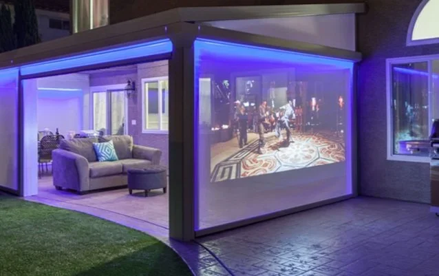 Motorized screen systems like MagnaTrack provide flexible protection from sun, wind, insects, and light rain while preserving airflow and openness. The screens lower when needed and retract for a more open patio experience.