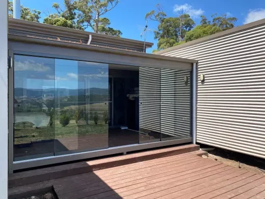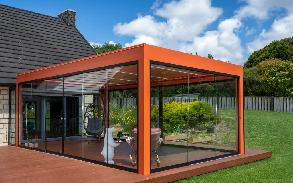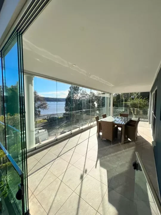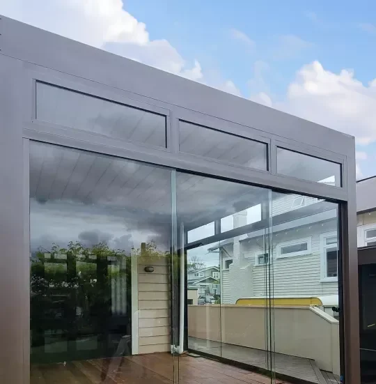 Glass doors and fixed glass panels create a sleek, modern enclosure while keeping views open and bringing in natural light. This option is ideal for homeowners who want a more finished look with added protection.